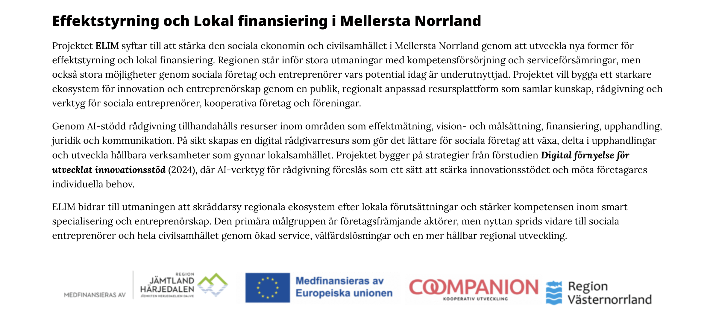 Coompanion Jämtland Härjedalen främjar entreprenörskap som värnar om social, ekonomisk och miljömässig hållbarhet. Vårt arbete resulterar i företag som tar samhällsansvar, lokal utveckling och en mångfald av ägarmodeller i det svenska näringslivet.